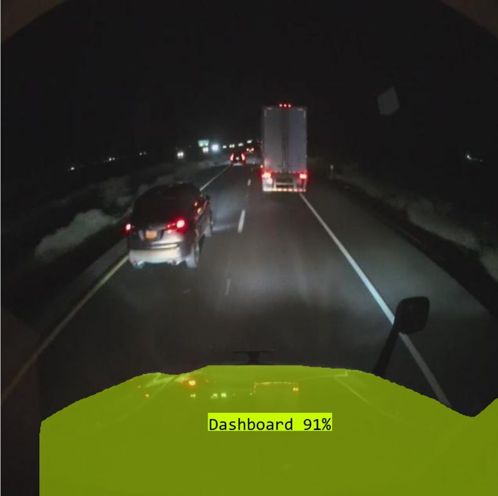 In order to render the overlay for the following distance on the video, it is necessary to detect if the vehicle dashboard/hood is visible in the video and if so to segment it as a polygon so the video renderer can subtract this mask from the road overlay resulting in a much higher quality end result.