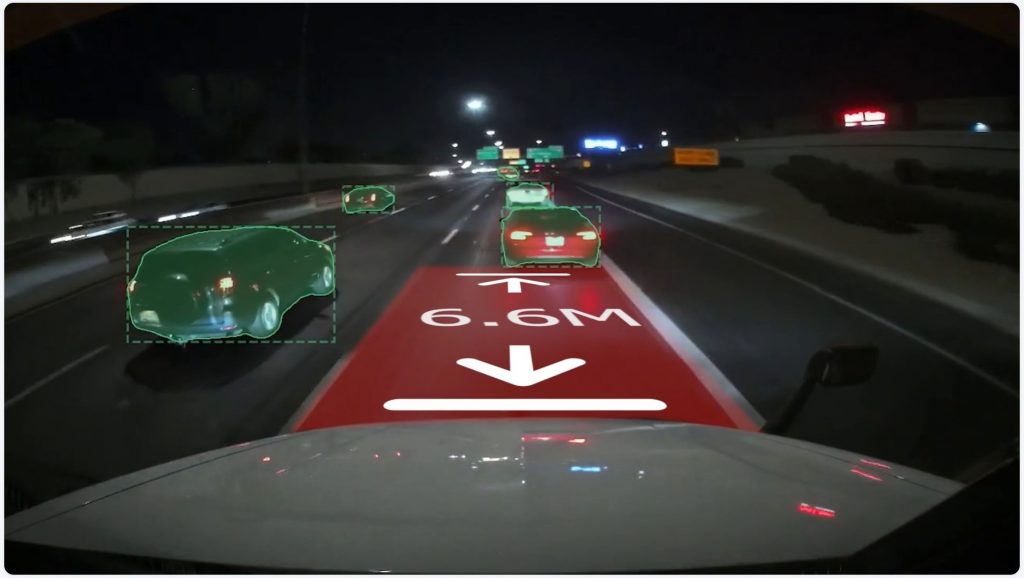 This model is based on YOLO “You only look once” an Detectron object segmentation to create visually impressive AI video overlays. When combined with AI meta data from supported cameras, we can additionally generate context specific overlays such as forward collision warnings, where the warning and the measurement is overlaid in the video scene.
