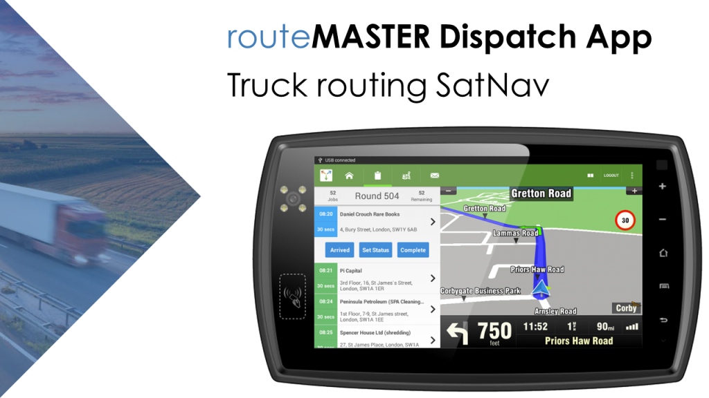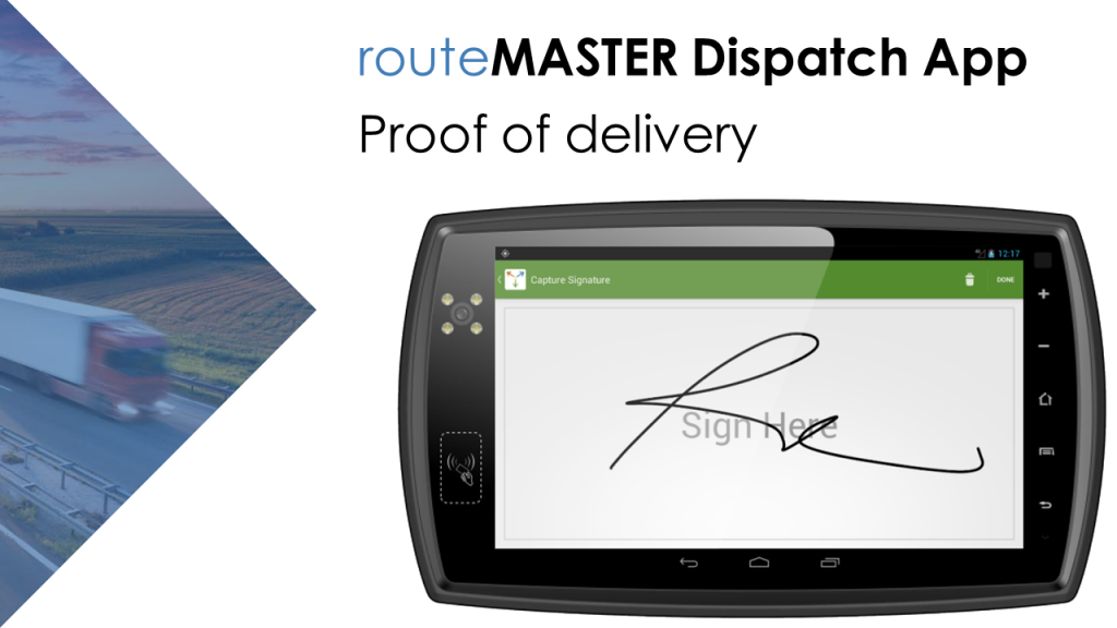 RouteMaster Dispatch – Allows drivers to log in and view the days orders. Orders can be selected which can activate turn by turn navigation to the address, the driver can then capture the customers signature and or photos of the delivered items, this is then synchronised back the server for management in the routeMaster platform.
